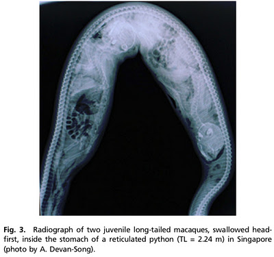 The paper also has some great pictures of a huge python that was killed and flayed by an Agta group in the early 1970s (more in info here in Science). At right is another sweet pic from the paper, an X-ray of a snake that has swallowed whole TWO juvenile monkeys!