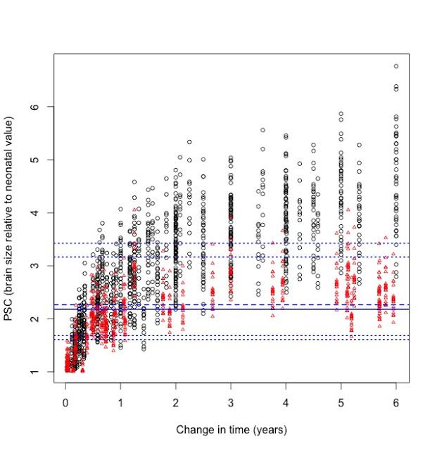 The plot above depicts brain size relative to newborns: each circle (humans) and triangle (chimpanzees) represents the proportional size difference between a newborn (less than 1 week) and an older individual, up to 6 years. Obviously, relative brain size gets bigger in humans and chimpanzees over time. Interestingly, even though humans and chimps have very different brain sizes, the proportional brain size changes overlap a lot between species, especially at younger ages. Ah, the joys of cross-sectional samples.