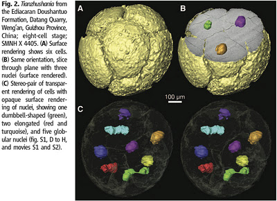 Huldtgren, T., Cunningham, J., Yin, C., Stampanoni, M., Marone, F., Donoghue, P., & Bengtson, S. (2011). Fossilized Nuclei and Germination Structures Identify Ediacaran “Animal Embryos” as Encysting Protists Science, 334 (6063), 1696-1699 DOI: 10.1126/science.1209537